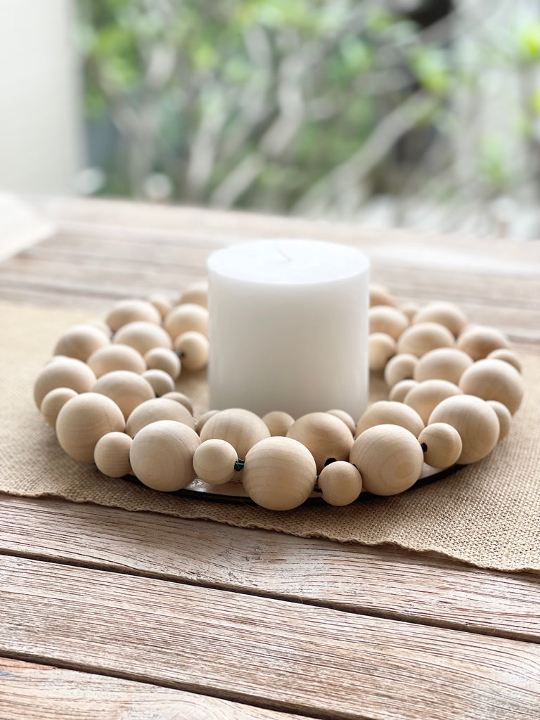 this handwoven beaded garland features large solid natural timber beads - perfect for holiday season decorating either as a wreath or table centre ...