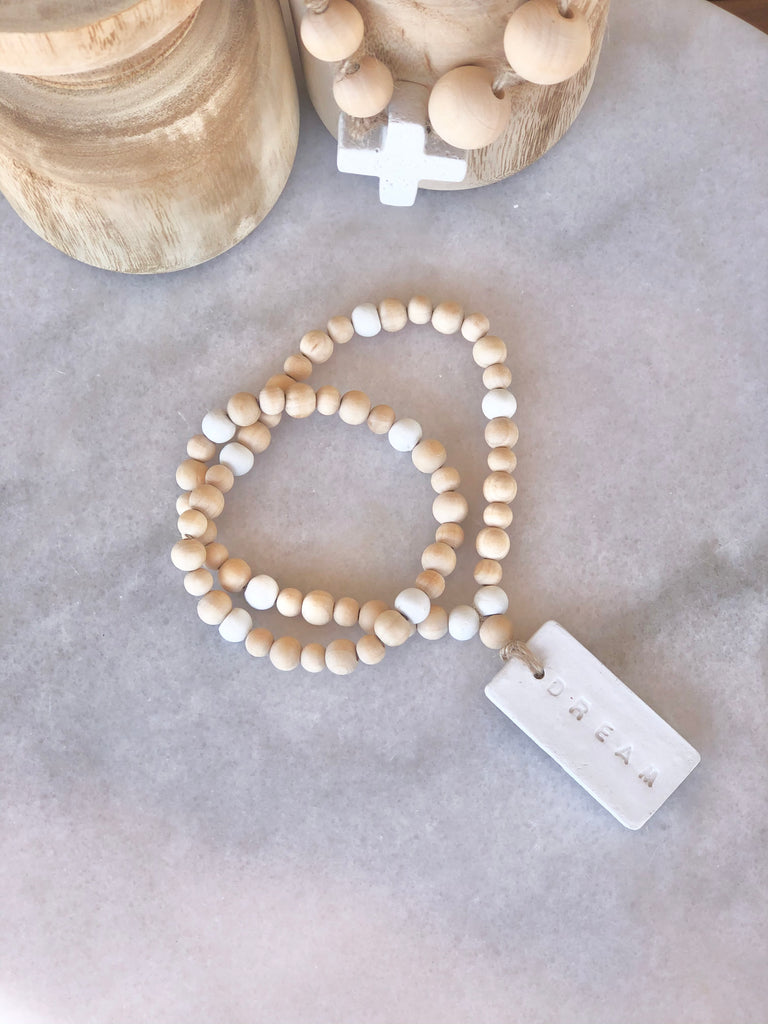 the dream beads are a combo of wooden beads with handmade lightweight polished cement beads thread onto jute rope, finished off with a dream charm ...
