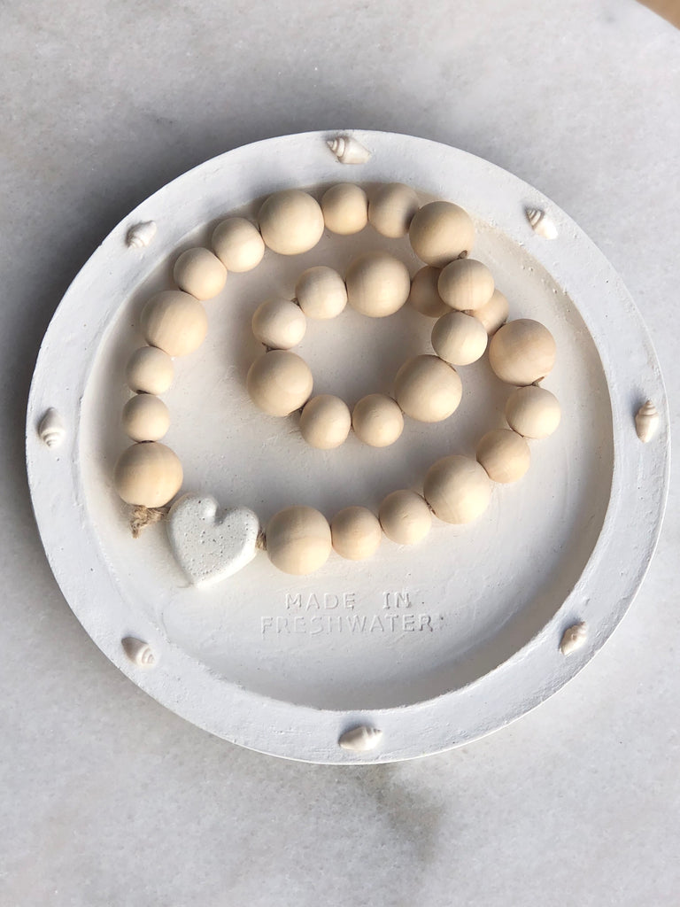 luna love beads are made up of large and medium natural wooden beads, jute rope and secured with a hand poured polished cement heart, lovely on a p...
