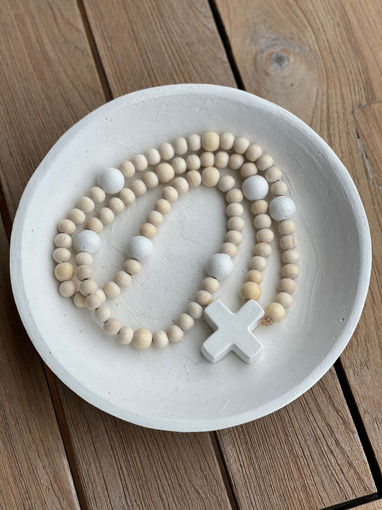 our new rosy beads are a combo of wooden beads with handmade lightweight polished cement beads thread onto jute rope. lovely on a plate, draped ov...